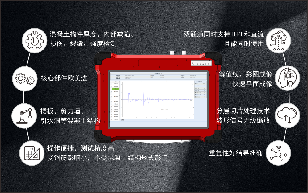 产品功能:混凝土构件厚度、波速、内部缺陷、损伤、裂缝、强度检测。