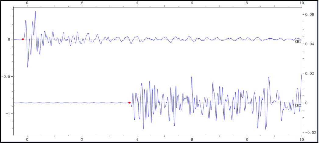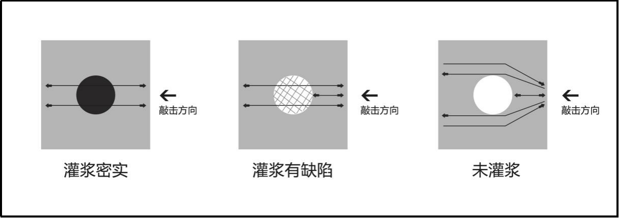 该测试方法为基于冲击回波研发的无损检测方法,检测结果相对较准确,可基本确定管道压浆的压浆缺陷位置。沿孔道纵向进行测试,激振点在孔道上方或侧方,以扫描的形式连续测试,通过信号的反射、绕射特性判断孔道内部压浆状况。综合考虑测试区间(孔道)的压浆质量,得到孔道压浆密实度状况。根据振动信号在传播过程中的特性变化判定压浆缺陷的有无和类型。
